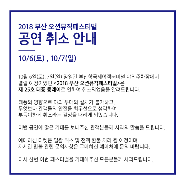 2018 부산 오션 뮤직페스티벌(김범수 넬 이수 외) 취소안내입니다.