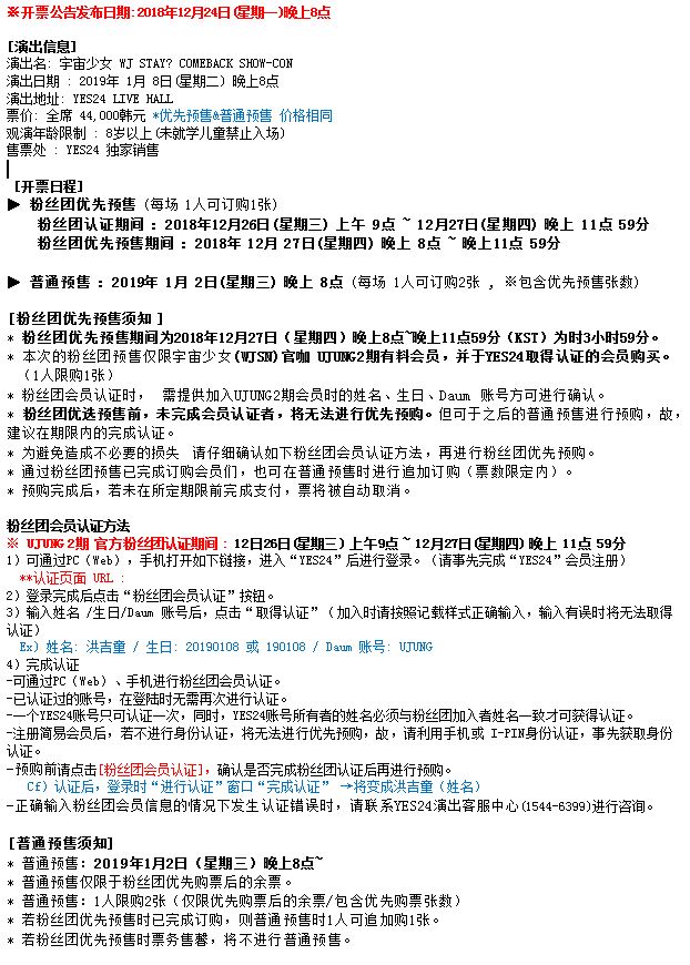 * Fan Club Pre-Sale Tickets: 2018. Dec. 27(Thur) PM 08:00~11: 59(KST)/3h59m