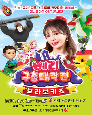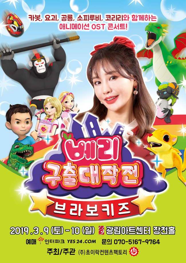 공연 제목 : 브라보키즈 - 베리 구출대작전 공연 일시 : 2019년 3월 9일 11시 15시 / 3월 10일 14시 공연 시간 : 60분~70분 공연 장소 : 서울 광림아트센터 장천홀 티켓 가격 : 1층 R석 50,000원 1층 S석 40,000원 / 2층 A석 30,000원 관람연령 : 20개월 이상