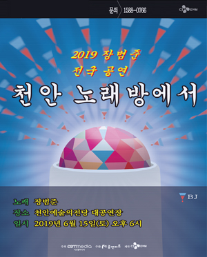 공 연 명 : 2019 장범준 전국공연 <노래방에서> - 천안 공연일시 : 2019년 06월 15일(토) 공연시간 : 토 6PM 티켓가격 : 전석 99,000원 공연장소 : 천안예술의전당 대공연장 관람등급 : 만 7세이상관람가