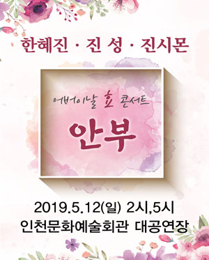 - 공 연 명 : 어버이날 효 콘서트 “안부” 한혜진, 진성, 진시몬 - 인천 - 공연일시 : 2018년 5월 12일(일) - 공연시간 : 14:00 / 17:00 - 공연장소 : 인천문화예술회관 대공연장 - 런닝타임 : 110분 - 관람등급 : 만 7세이상 (만 7세미만 입장불가) - 티켓가격 : VIP석:99,000원 / R석88,000원 / S석 77,000원
