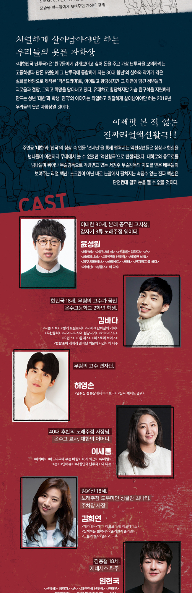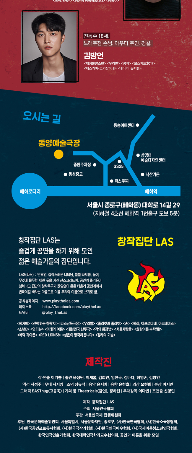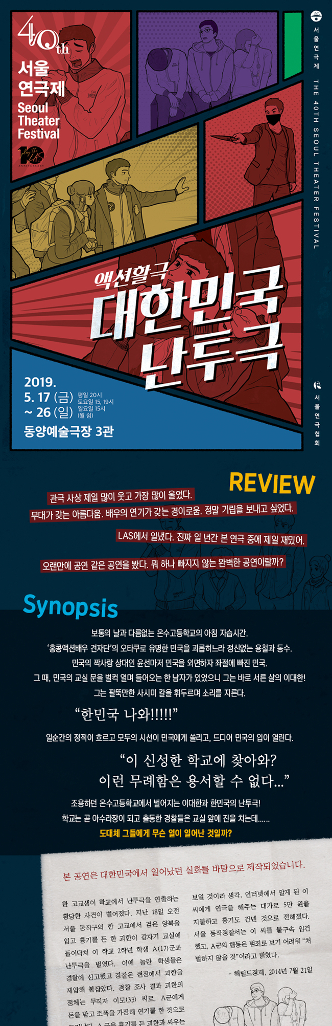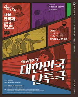 공연 제목 : 제40회 서울연극제 공식선정작_대한민국 난투극 공연 기간 : 2019년 5월 17일(금) ~ 2019년 5월 26일(일) 공연 시간 : 평일 오후 8시 | 토요일 오후 3시, 7시 | 일요일 오후 3시 (월 쉼) 공연 장소 : 동양예술극장 3관 티켓 가격 : 전석 3만원