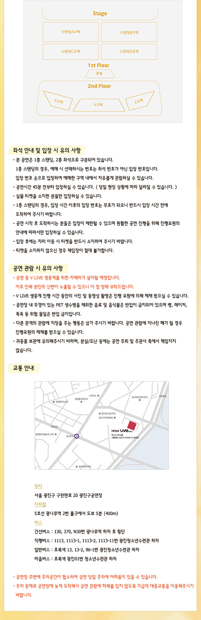- 공연장 내 뚜껑이 있는 PET 생수병을 제외한 음료 및 음식물은 반입이 금지되어 있으며 병, 레이저, 폭죽 등 위험 물질은 반입 금지입니다.