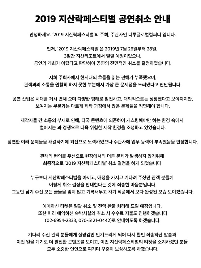 2019 지산락페스티벌 공연 취소 안내 입니다.