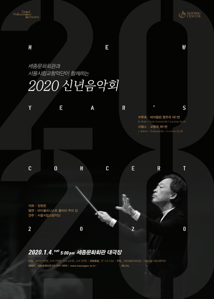 공연명 : 세종문화회관과 서울시립교향악단이 함께하는 <2020 신년음악회> 공연일시 : 2020.1.4.(토) 17:00 공연장소 : 세종문화회관 대극장 티켓가격 : VIP석 9만원, R석 7만원, S석 4만원, A석 3만원 관람연령 : 만 7세이상