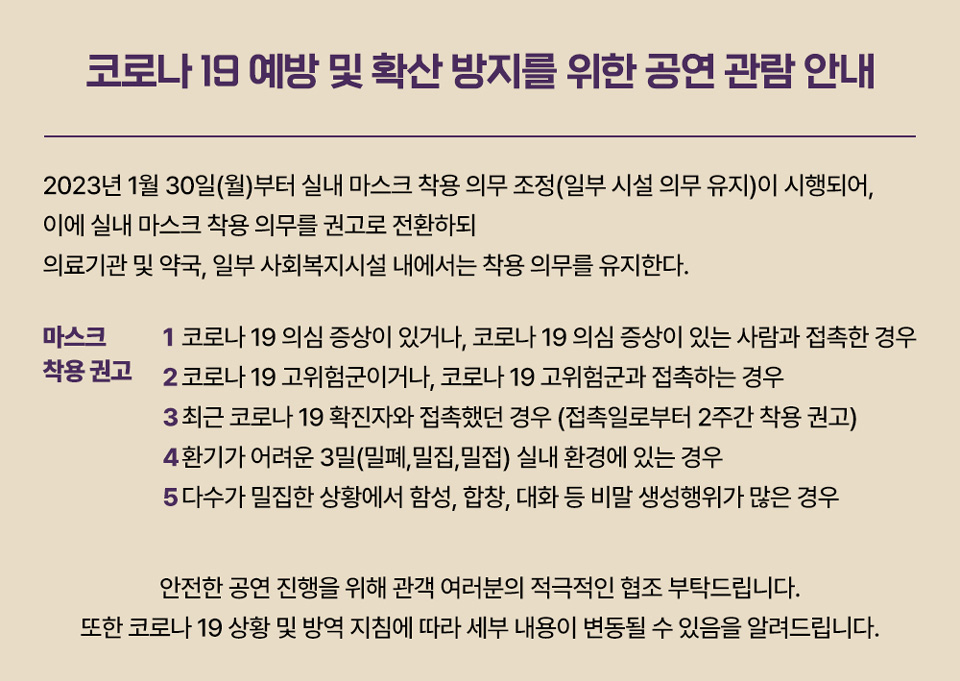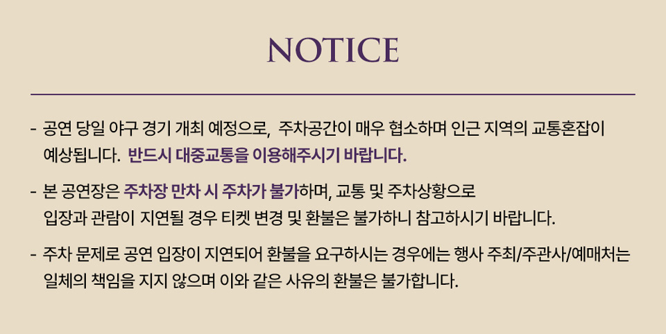※ 본 공연은 가상계좌 입금 마감 시간이 예매 당일 23시 29분이오니, 무통장 입금 선택 예매 시 착오 없으시기 바랍니다.