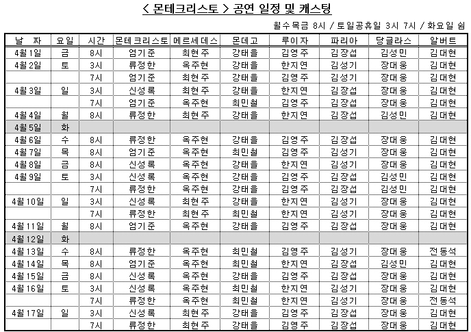 - 공 연 명 : 뮤지컬 몬테크리스토 (Musical Monte Cristo)