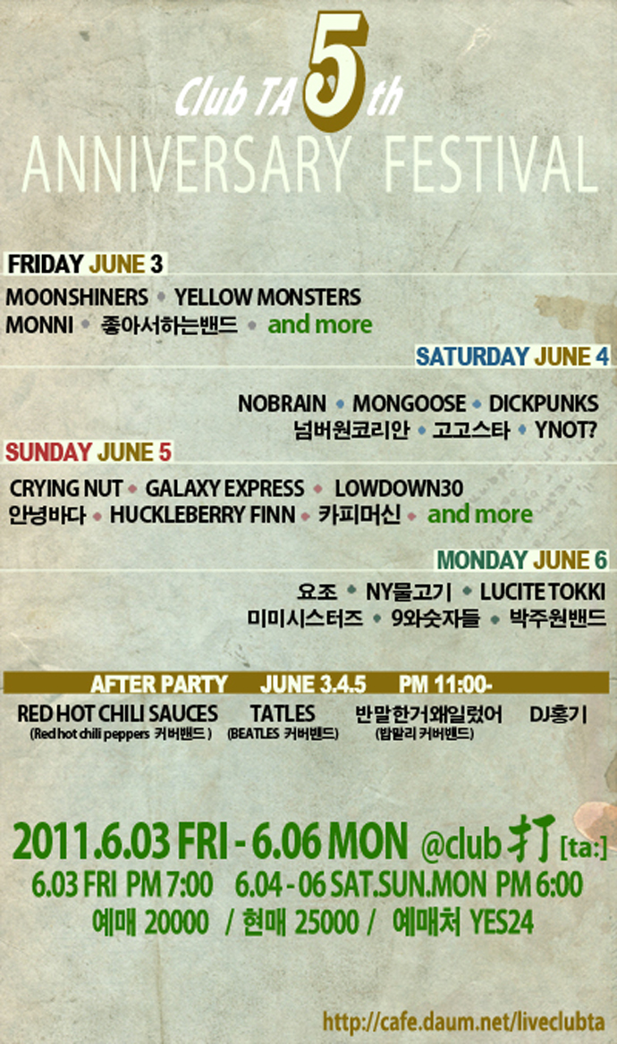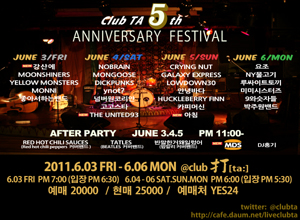 [공연정보] - 공연명 : 클럽타 5주년 기념 페스티벌 - 공연일시 : 20011년 6월3일 ~ 6월 6일 - 가격 : 예매 20,000원 / 현매 25,000원 - 스탠딩 석으로 200명 예매순 입장 (예매시 선택하는 번호가 입장 순서입니다.) [기획사정보] - 주최 : Label 打[ta:] - 주관 : Label 打[ta:] - 문의 : café.daum.net/liveclubta | labelta@naver.com