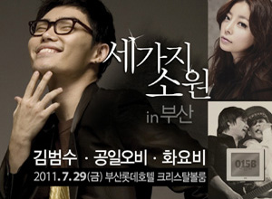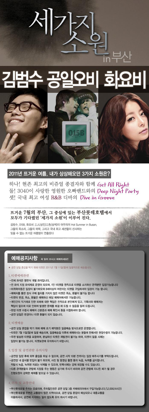 [공연정보] 공연 기간 : 2011.07.29 공연 시간 : 1회 19:00/ 2회 23:00 공연 장소 : 부산롯데호텔 3층 크리스탈볼룸 티켓 가격 : R석 99,000원 S석 88,000원 A석 77,000원 [기획사 정보] 주최 : ㈜부산롯데호텔 주관 : 디엠지엔터테인먼트, 디엠지투어 문의 : 02-3472-9321