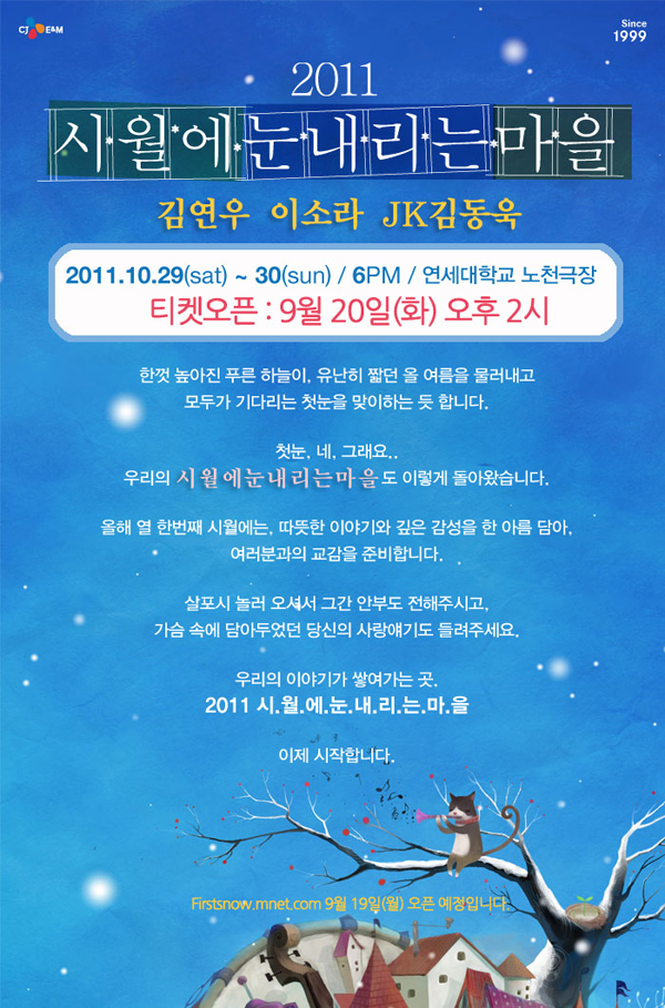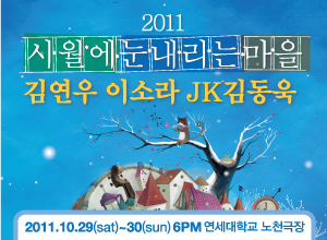 [공연개요] - 공연명 : 2011 시월에눈내리는마을 - 출연진 : 김연우, 이소라, JK김동욱 - 공연일시 : 2011년 10월 29일(토)~30일(일) / 저녁 6시 - 공연장소 : 연세대학교 노천극장 [기획사정보] - 기획/제작 : ㈜ CJ E&M