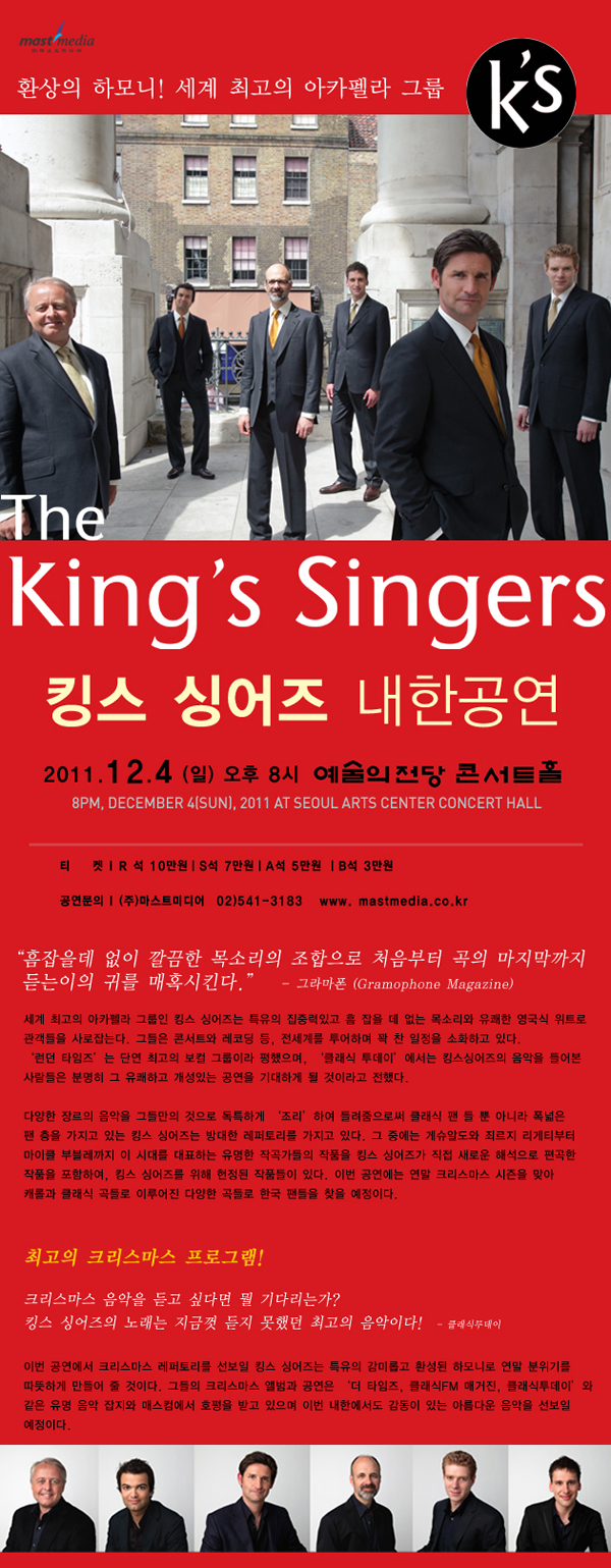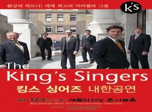 [공연정보] • 공 연 명 : 킹스 싱어즈 내한공연 • 공연일시 : 2011년 12월 4일(일) 오후 8시 • 공연장소 : 예술의전당 콘서트홀 • 티켓금액 : R석 10만 / S석 7만 / A석 5만 / B석 3만 [기획사정보] • 주최/주관: ㈜마스트 미디어 02)541-3183 <지방 공연 일정> 12월3일(토) 안산 안산문화예술의전당 12월5일(월) 대구 수성아트피아