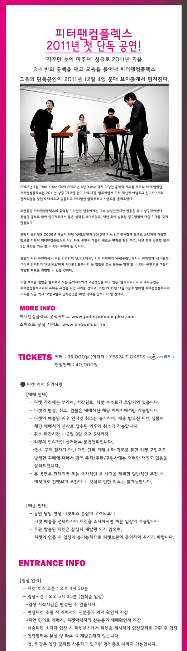 공연 기간 : 2011년 12월 4일 (일) 공연 시간 : 오후 6:00 공연 장소 : 홍대 V-Hall 티켓 가격 : 예매시 35,000원 / 현장판매 40,000원 주최 : SHOWMUST, YAP Entertainment 주관 : YAP Entertainment