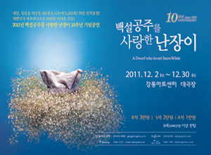 2001년 5월 4일 초연 이래 2,300회! 70만 관객! 대만, 일본을 비롯한 120개 도시투어!! 웃음, 감동, 눈물! 20, 30대 연인이 가장 보고 싶어 하는 연극!! 어린이와 어른 그리고 사랑하는 사람이 함께 보는 연극!!짝사랑을 향한 난장이의 애틋한 마음을 표현하는 몸짓 하나하나는 관객들의 마음을 뜨겁게 적신다. 상상력이 빛나는 연출과 뮤지컬로도 손색없는 아름다운 음악이 함께하는 <백설공주를 사랑한 난장이> 2011년 연말을 보내는 가족, 연인, 친구들과 함께 볼 것을 추천한다.