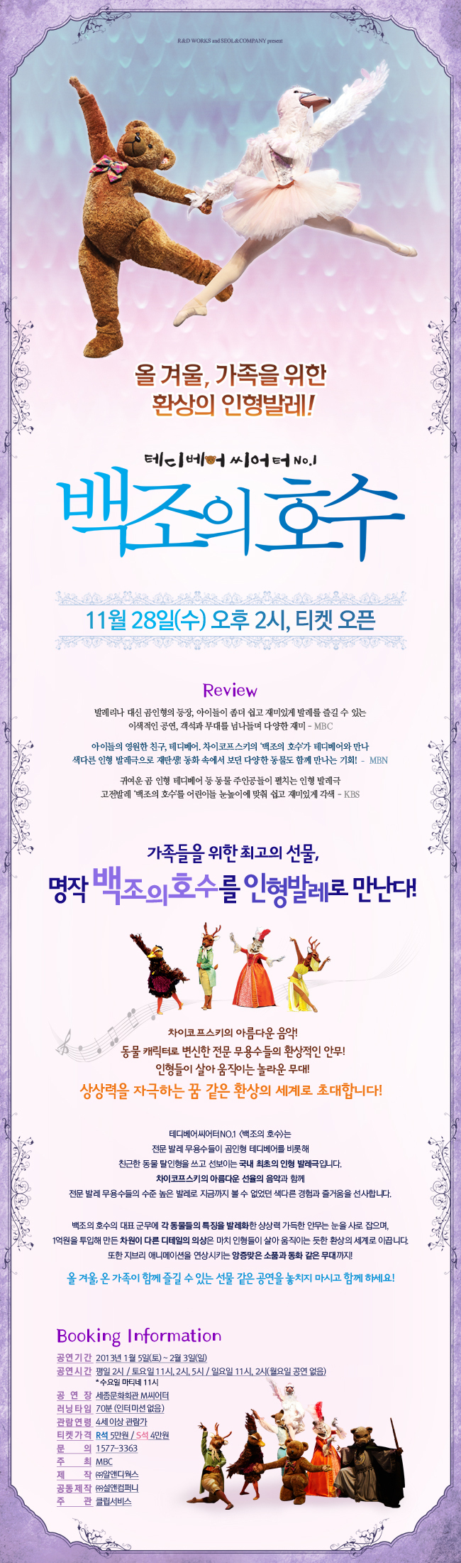 [BOOKING INFORMATION] BOOKING INFORMATION 공연기간 2013년 1월 5일(토) ~ 2013년 2월 3일(일) 공연시간 평일 2시 / 토요일 11시, 2시, 5시/ 일요일 11시, 2시(월요일 공연없음) * 수요일 마티네 11시 공연장 세종문화회관 M씨어터 러닝타임 70분(인터미션 없음) 관람연령 R석 5만원 / S석 4만원 문의 1577-3363 제작 알앤디웍스 공동제작 설앤컴퍼니 주관 클립서비스