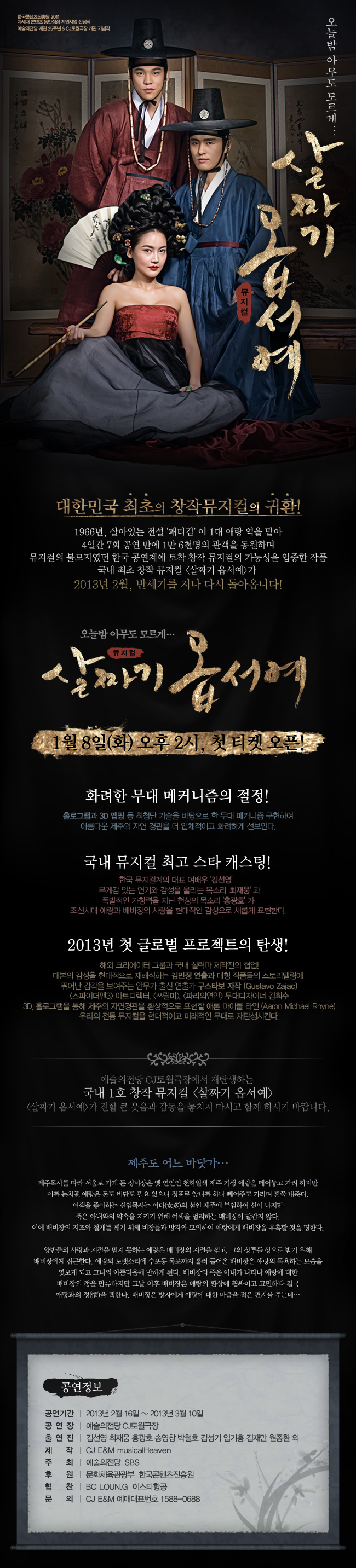 - 공연기간 : 2013년 2월 16일 ~ 3월 10일 - 공연장 : 예술의전당 CJ토월극장 - 출연진 : 김선영 최재웅 홍광호 송영창 박철호 김성기 임기홍 김재만 원종환 외 - 제작 : CJ E&M musicalHeaven - 주최 : 예술의전당 SBS - 후원 : 문화체육관광부 한국콘텐츠진흥원 - 협찬 : BC LOUN.G 이스타항공