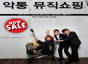 2012년 탑밴드 방송 이후 줄기차게 달리고 있는 어쿠스틱 락 밴드 악퉁은 지난 11월 'Don't Cry 악퉁' 콘서트 이후 많은 공연과 페스티발, 1월의 악퉁 신년회, 대전, 부산, 창원 공연을 거쳐 ‘악퉁 뮤직쇼핑’ 콘서트가 2월 17일 일요일 오후 6:30 홍대 벨로주에서 열린다. ‘뮤직 쇼핑’이라는 타이틀을 내건 이번 콘서트는 단순히 1부, 2부가 아닌 재고상품코너, 이월상품코너, 신상품코너와 같은 컨셉으로 콘서트를 진행하여 마치 관객이 객석에서 장을 보는 듯한 기분을 느낄 수 있게 할 예정이다.