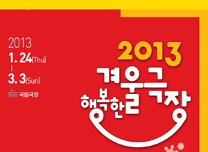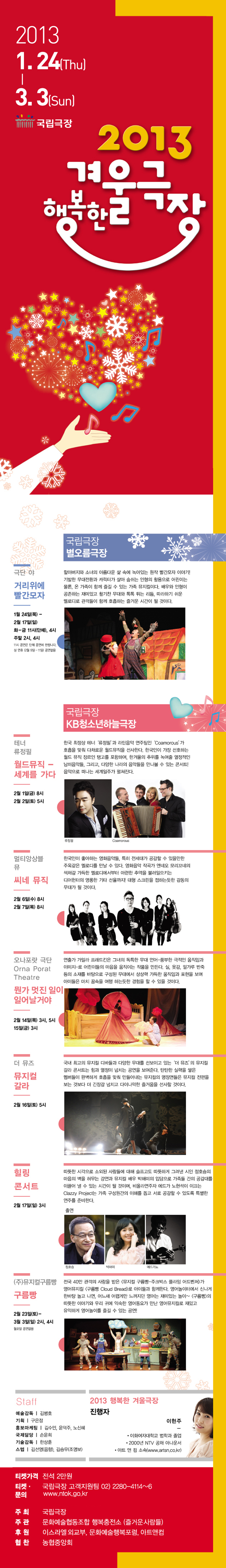 공연일자 및 공연명 : 2013 국립극장 겨울축제 티켓 연극 거리위에 빨간모자 1/24~2/17 예매하기 콘서트 <월드뮤직-세계를 가다> 2/1~2/2 예매하기 콘서트 <씨네 뮤직> 2/6~2/7 예매하기 연극 뭔가 멋진 일이 일어날꺼야 2/14~2/15 예매하기 <뮤지컬 갈라> 2/16 예매하기 <힐링 콘서트> 2/17 예매하기 <어린이 영어뮤지컬 구름빵> 2/23~3/3 예매하기