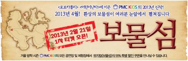 <어린이난타>, <로보카폴리>를 잇는 2013년 PMCKIDS 신작! 송승환의 명작동화 시리즈 네번째! 뮤지컬 보물섬 2013년 4월! 환상의 보물섬이 여러분 눈 앞에서 펼쳐집니다.