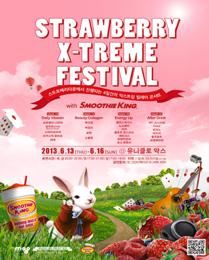 어쿠스틱, 발라드, 락, 힙합, 다양한 장르의 최고의 아티스트들이 함께하는 4일간의 릴레이 콘서트와 아름다운 젊음을 만들 수 있는 게임 등 즐거움이 가득한 스트로베리 익스트림 페스티벌에 여러분을 초대합니다.