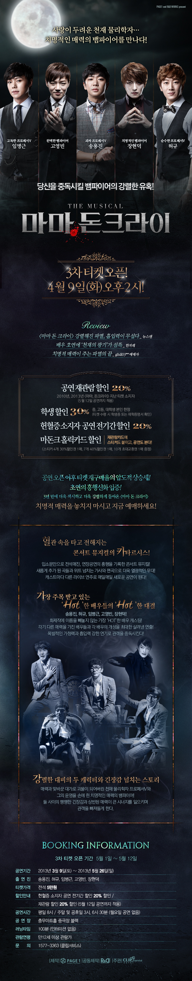 . 공연기간: 2013년 3월 9일(토) ~ 2013년5월 26일(일) . 출연진: 송용진, 허규, 임병근, 고영빈, 장현덕 . 티켓 가격: 전석 5만원 . 공연시간: 평일8시 / 주말 및 공휴일 3시, 6시30분 (월요일 공연 없음) . 공연장:충무아트홀 중극장 블랙 . 러닝타임:100분(인터미션 없음) . 관람연령: 만12세 이상 관람