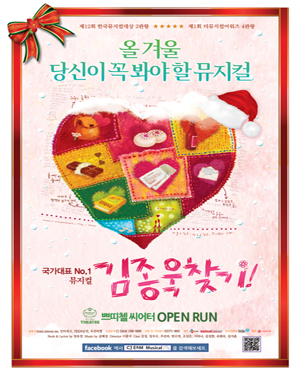 - 공 연 명 : 뮤지컬 <김종욱 찾기> - 공 연 장 : 쁘띠첼 씨어터 - 공연기간 : Open Run - 공연시간 : 화요일, 목요일 8시 / 수요일, 금요일 5시, 8시 / 토요일 3시, 7시 / 일요일, 공휴일 2시, 6시 / 5월 3일 8시공연 (월 쉼) - 티켓가격 : 전석 30,000원 - 관람연령 : 12세 이상 관람가 - 러닝타임 : 100분 * 5월 티켓오픈 공연기간 : 2013년 5월 1일~ 2013년 5월 31일 공연