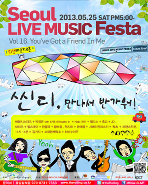 5월 24일, 25일 서울 라이브 뮤직 페스타 vol.16은 홍대에 새롭게 등장한 티켓라운지 ”씬디(Xindie)”를 환영하는 전야제와 서울 라이브 뮤직 페스타 공연이 홍대 주차장 거리와 롤링홀, 에반스라운지, 프리버드, 프리즘홀 에서 열린다.