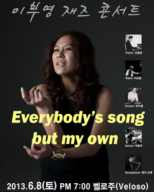 지난 2월 벨로주 공연을 통해 재즈 보컬리스트 이부영은 다시 한번 우리에게 재즈 보컬 그리고 재즈 스탠다드의 의미와 미덕을 일깨워주었다. 그런 그녀가 새로운 편성으로 다시 한번 스탠다드를 노래하는 무대를 준비하였다. 케니 윌러의 작품 ‘Everybody’s Song But My Own’을 타이틀로 재즈 스탠다드를 중심으로 한 ‘우리 모두를 위한 노래’가 그것이다. 이부영은 2010년 데뷔작 <One Day>를 발표한 이후 피아노와의 듀오 혹은 피아노-기타-베이스로 이루어진 트리오를 중심으로 활동을 하였는데 드럼과 함께 공연하는 경우가 매우 드물었다. 그런데 이번에는 모처럼 드럼이 함께 하는 공연으로 이부영을 알고 있는 재즈팬들에게 벌써부터 큰 관심을 끌고 있다. 여기에 색소폰까지 더해져 총 다섯 명의 연주자가 곡마다 다양한 편성으로 참가하는 매우 화려한 구성의 공연을 준비하였다.